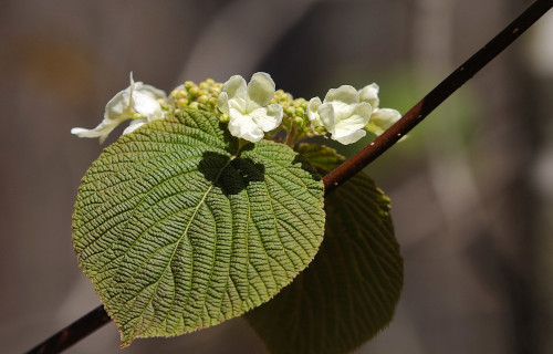 Yet, it’s doubtless the blooms of the Witch-Hobble that garner the most interest from the average viewer. Though individually small, they appear in large clusters 4 – 6 in (10 – 15 cm) wide. Large sterile, white or cream flowers ring the outer edge, surrounding small fertile flowers in the center.